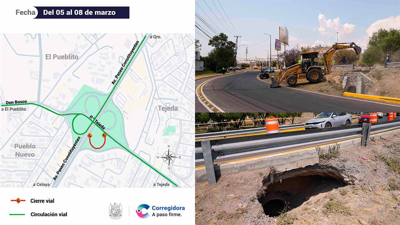 - Con el objetivo de garantizar la seguridad vial de las personas que transitan por la zona, se implementó el cierre total a la circulación sobre el Puente de Tejeda, en la salida hacia Constituyentes oriente (incorporación a Querétaro), medida que permanecerá vigente hasta el domingo 08 de marzo.